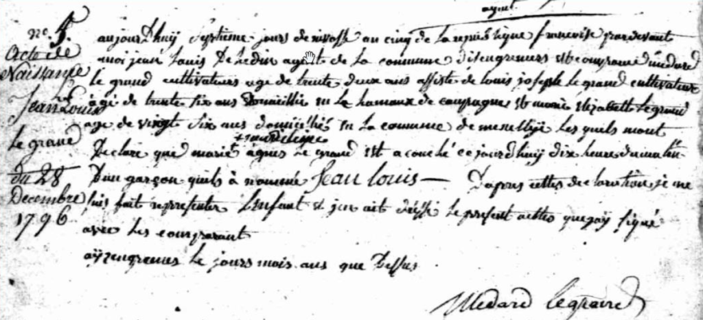 Jean Louis LEGRAND naît le 28 décembre 1796 à Yzengremer, dans la Somme. Il est fils de Nicolas Médard, trente ans, cultivateur, et Marie Madeleine Agnès LEGRAND, vingt-trois ans.